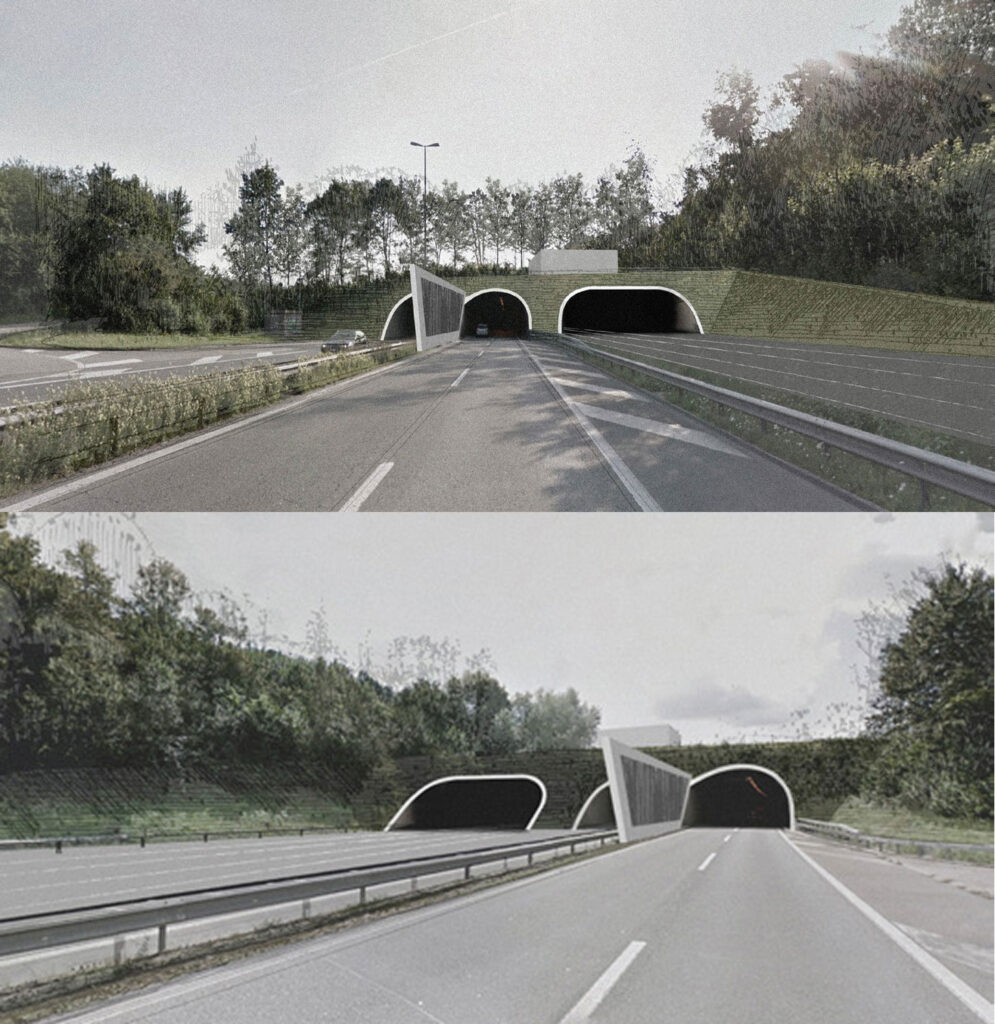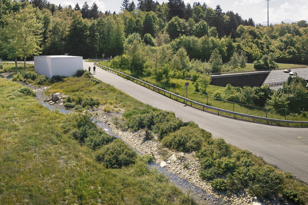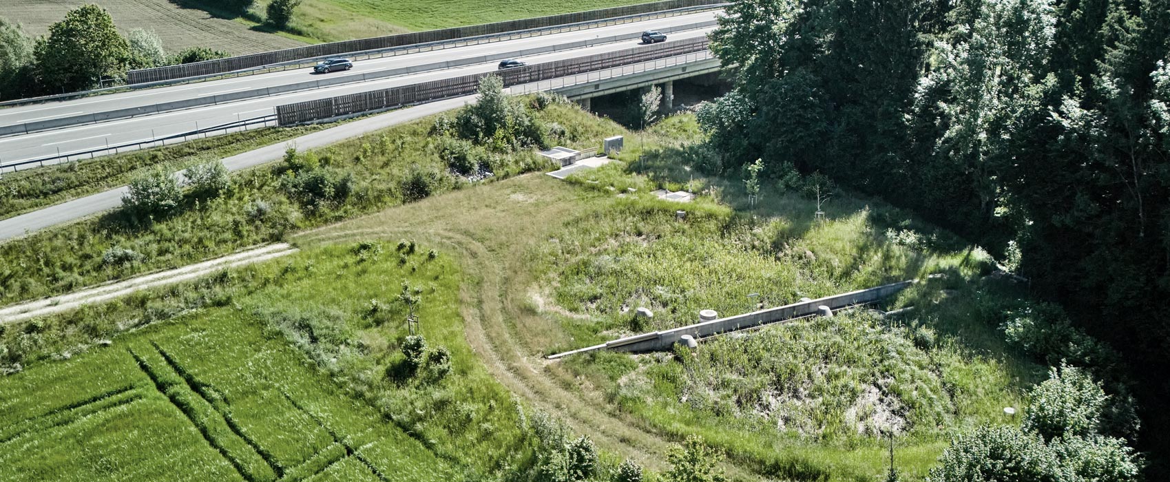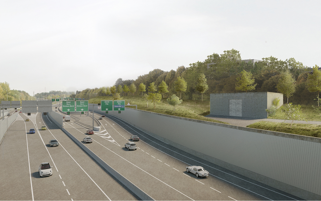 Die Portalräume beim Tunnel Rathausen und die Böschungen entlang der A14 nehmen die flach ansteigende Moränenlandschaft auf und werden ohne Stützmauern realisiert. Die Räume bleiben grün.