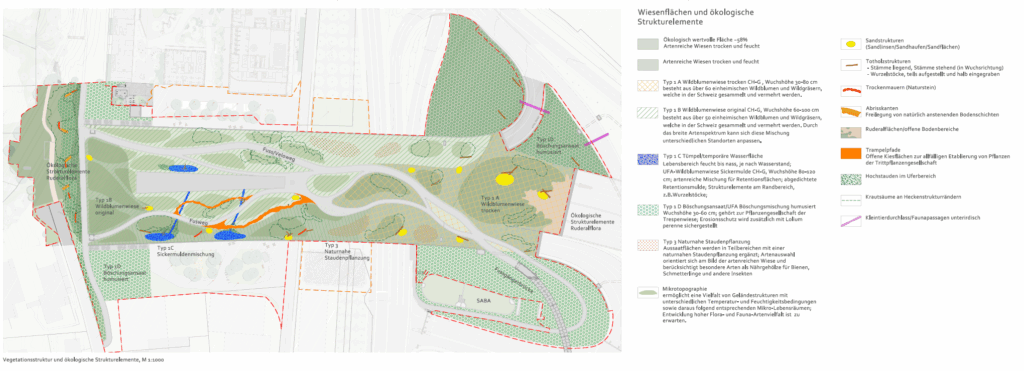 Auf der Grosshofbrücke entsteht eine Grünfläche mit unterschiedlichen Wildblumenwiesen, naturnahen Staudenflächen, Futter- und Nisthügeln sowie Stein- und Asthaufen. Regenwasser versickert in oberflächlichen Sickermulden, wodurch feuchte bis nasse Lebensräume entstehen. Die Wiesenflächen werden durch einheimische und artenreiche Baum-, Strauch und Wildheckenpflanzungen ergänzt.