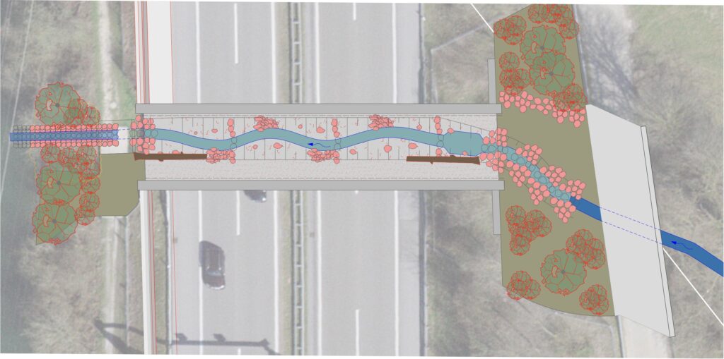 Östlich des Rathausentunnels entsteht eine aufgewertete Wildtierunterführung. Sie schafft für Kleintiere wie zum Beispiel Dachse, Biber und Füchse eine sichere Verbindung zwischen der Reuss und dem Wildreservat Riedholz. Durch den zwei Meter breiten Durchgang fliesst auch ein kleiner Bach. Fest verankerte Totholzstämme – wegen des Hochwassers – erleichtern Kleintieren die Durchquerung.