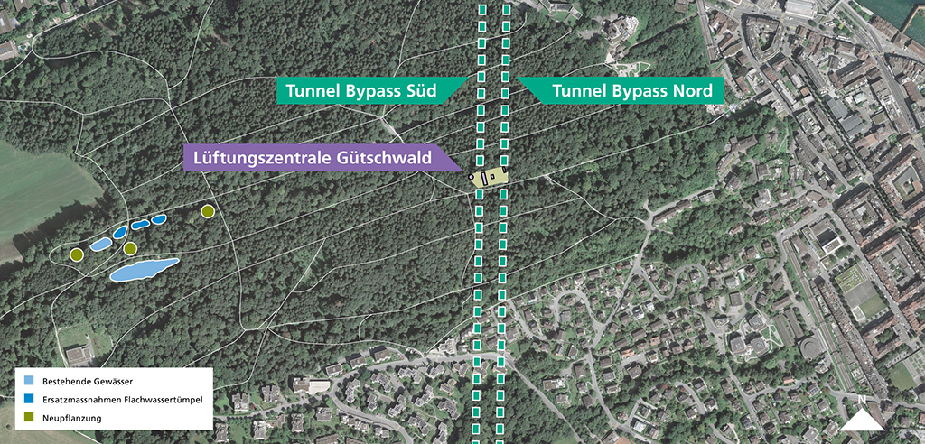 Die neue Lüftungszentrale Gütschwald wird durch einen arten- und strukturreichen sowie stufigen Waldrand (Waldsaum) in die Umgebung eingebunden. Das Dach der Lüftungszentrale wird als Magerwiese begrünt. In der näheren Umgebung werden neben einem bestehenden Weiher und Tümpel drei neue Tümpel geschaffen. Es entstehen Feucht- und Nass-Lebensräume, die für amphibische Tiere neuen, wertvollen Lebensraum bieten